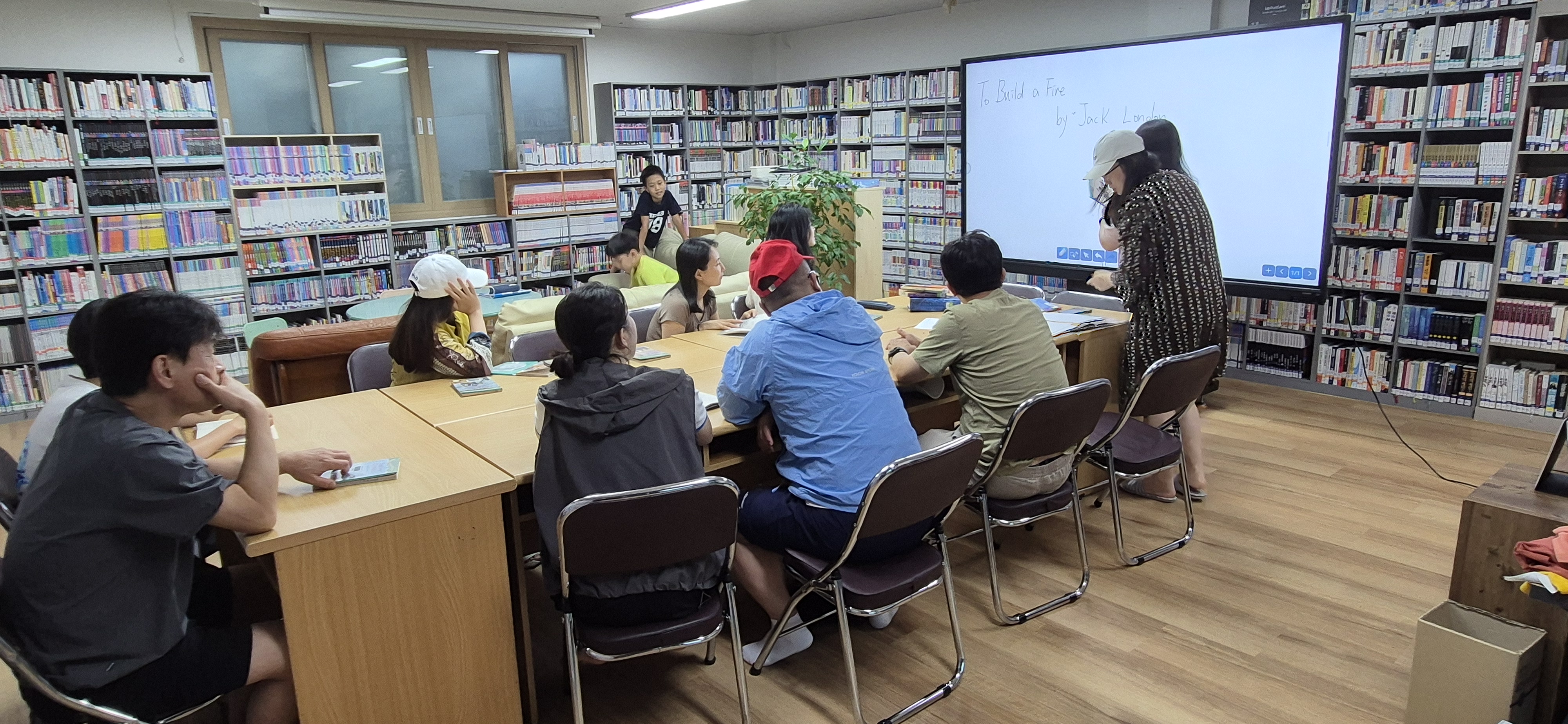 저희도서관에 자주 오는 회원님이 영어강사였다는걸 알고 오랜 대화 후 개설하게 된 수업이에요. 선생님이 저희 사정을 아셔서 무료로도 강의를 해 주신다고 하셔서 너무 감사했어요. 열심히 모집한 끝에 다행히 동참해주시는 분들의 남편분들도 같이 듣도 싶다해 아주 인기있는 강좌가 되었어요.(7월19일 시작으로 9월까지 )